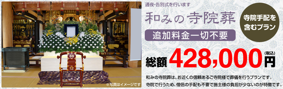 和みの寺院葬は菩提寺がない方や菩提寺が遠くにあり、お寺様と疎遠になっておられる方がお住まいの近隣などの信頼あるご寺院様にお願いする事ができ、寺院で葬儀を行うプランです。